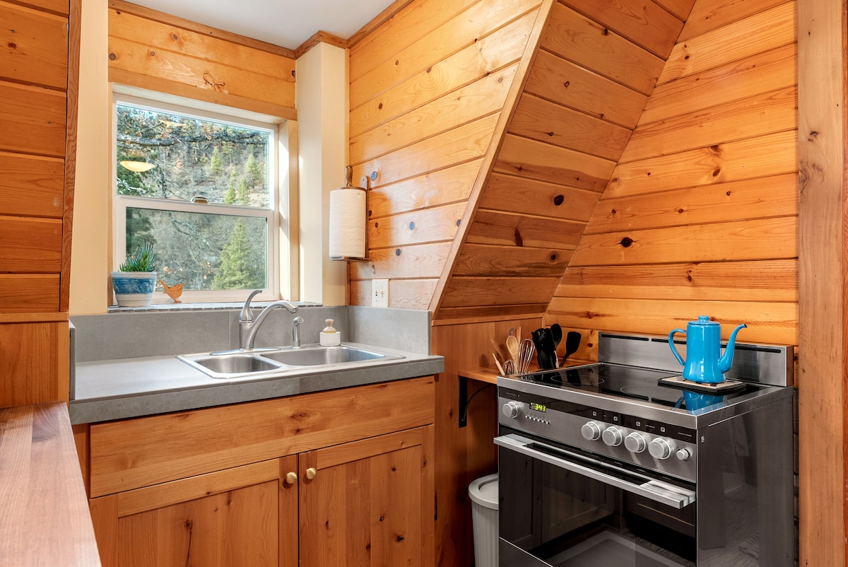 올렉트리 트리하우스라는 이름에 걸맞게 여름을 보내며 우리가 이 20피트 옥타곤 건물을 짓는 것을 지켜보던 여러 올렉트리 덕분입니다. 이 건물은 하나의 큰 42인치 오래된 더글러스 전나무 주변에 지어졌습니다. 대형 창문과 슬라이딩 도어가 있어 나무 위에 있는 느낌을 줍니다. 성인 2명이 숙박할 수 있습니다. 안전상의 이유로 반려동물이나 12세 미만의 어린이는 허용되지 않습니다. 입구는 수평이며 주차장이 가깝습니다. 청소비는 50달러이며 관련 세금은 이미 청구서에 추가되어 있습니다.