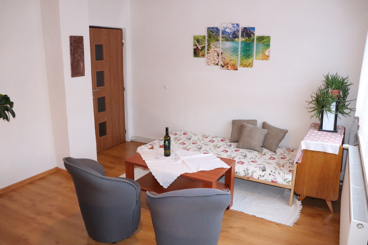 스포코이나 4는 최대 4인까지 이용할 수 있도록 설계된 현대적이고 인체공학적 디자인의 편안한 아파트입니다. 면적은 40㎡입니다. 이 아파트는 건물 1층에 위치해 있으며, 녹색의 전망을 자랑하는 정원 가구가 있는 전용 테라스를 갖추고 있습니다. 이 아파트에는 소파 베드, TV, 커피 테이블이 있는 편안한 거실과 완비된 간이 주방(냉장고, 스토브, 오븐, 후드, 주전자, 커피 메이커, 식기류)이 있습니다.