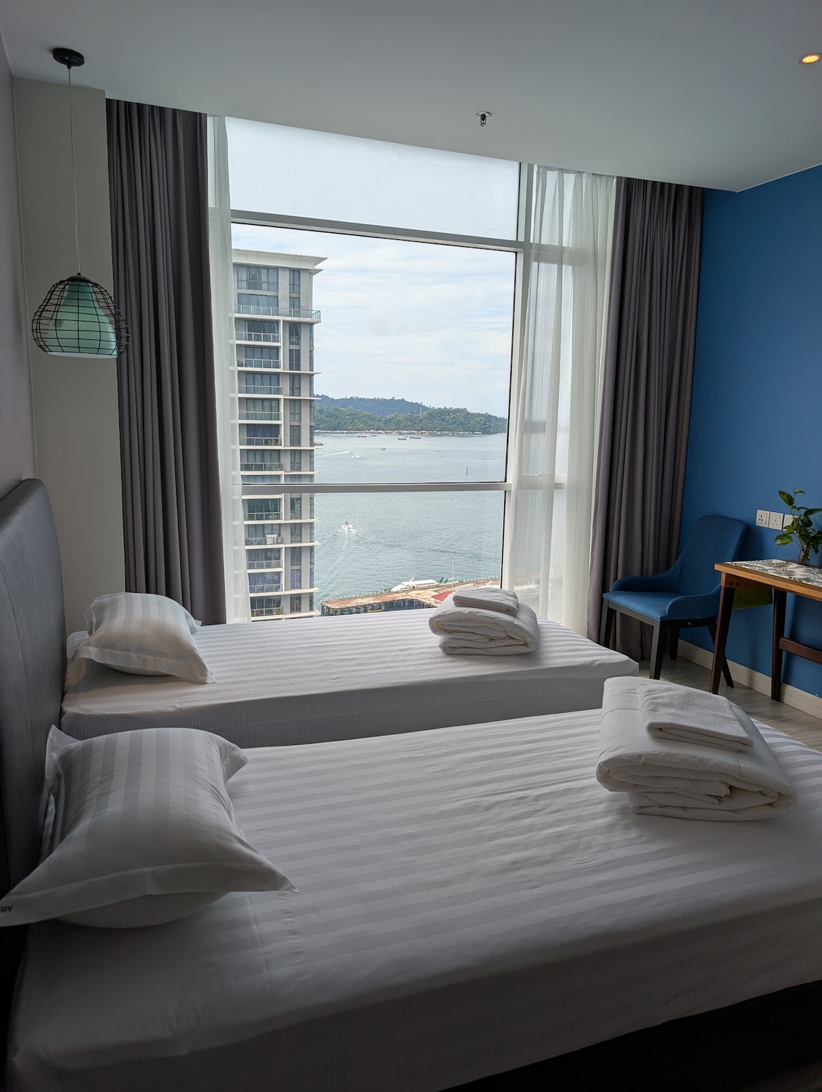 탁트인 3-Bay 바다전망과 썬셋을 즐길수 있는 고층 & 가장 넓은 객실 쇼핑몰과 주요 즐길거리가 모두 가까이 있는 시내 중심부에 위치해있습니다. 제셀톤 선착장 바로 옆이라 섬투어 시 도보 이동 가능합니다. 신축 건물에 보안이 철저하여 조용하고 안전합니다. • 침실 2개 - 퀸사이즈 침대 1개 및 싱글침대 2개 - 쇼파베드 2개 • 거실 - 스마트 TV , 에어컨 - 무료 와이파이 • 주방 - 정수기 - 냉장고, 냉동고 - 전자레인지, 전기쿡탑 - 조리 도구 및 식기 - 전기 주전자 • 욕실 2개 - 온수기, 헤어드라이어 - 수건, 바디샴푸, 샴푸, 핸드워시 • 헬스장 • 인피니티풀 <투어 및 조식 문의> 공항 픽업/드롭(유료), 반딧불, 골프, 레프팅, 섬투어, 씨워킹, 해양레져, 낚시, 키나발루마운틴, 나이트투어, 캘리베이, 민속촌, 맛사지, 씨푸드, 한식