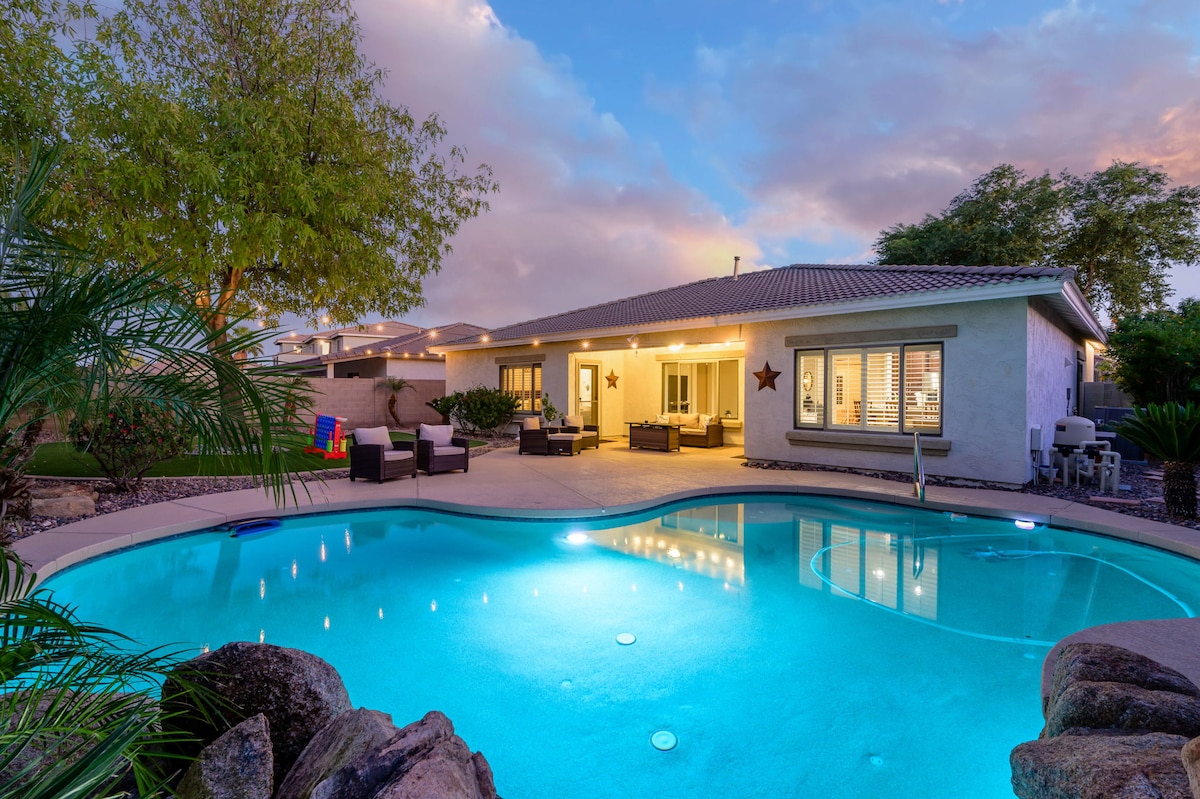 숨 막히는 골프 코스 전망을 감상할 수 있는 멋진 침실 2개, 욕실 2개의 숙소로 떠나보세요! 온수 수영장과 온수 욕조를 갖춘 전용 오아시스를 즐겨보세요. 완비된 고급 주방, 전용 업무 공간, 내 집 같은 편안함을 갖춘 2473평방피트의 넓은 숙소에서 휴식을 취해보세요. 근처 관광지 스카이 하버 공항 - 45분 (39.4마일) 웨스트게이트 엔터테인먼트 지구 - 27분 (18마일) 맥도웰 소노란 보호구역 - 50분 (34.6마일) 탈리에신 웨스트 - 53분 (37.9마일) 지금 휴가를 예약하세요!