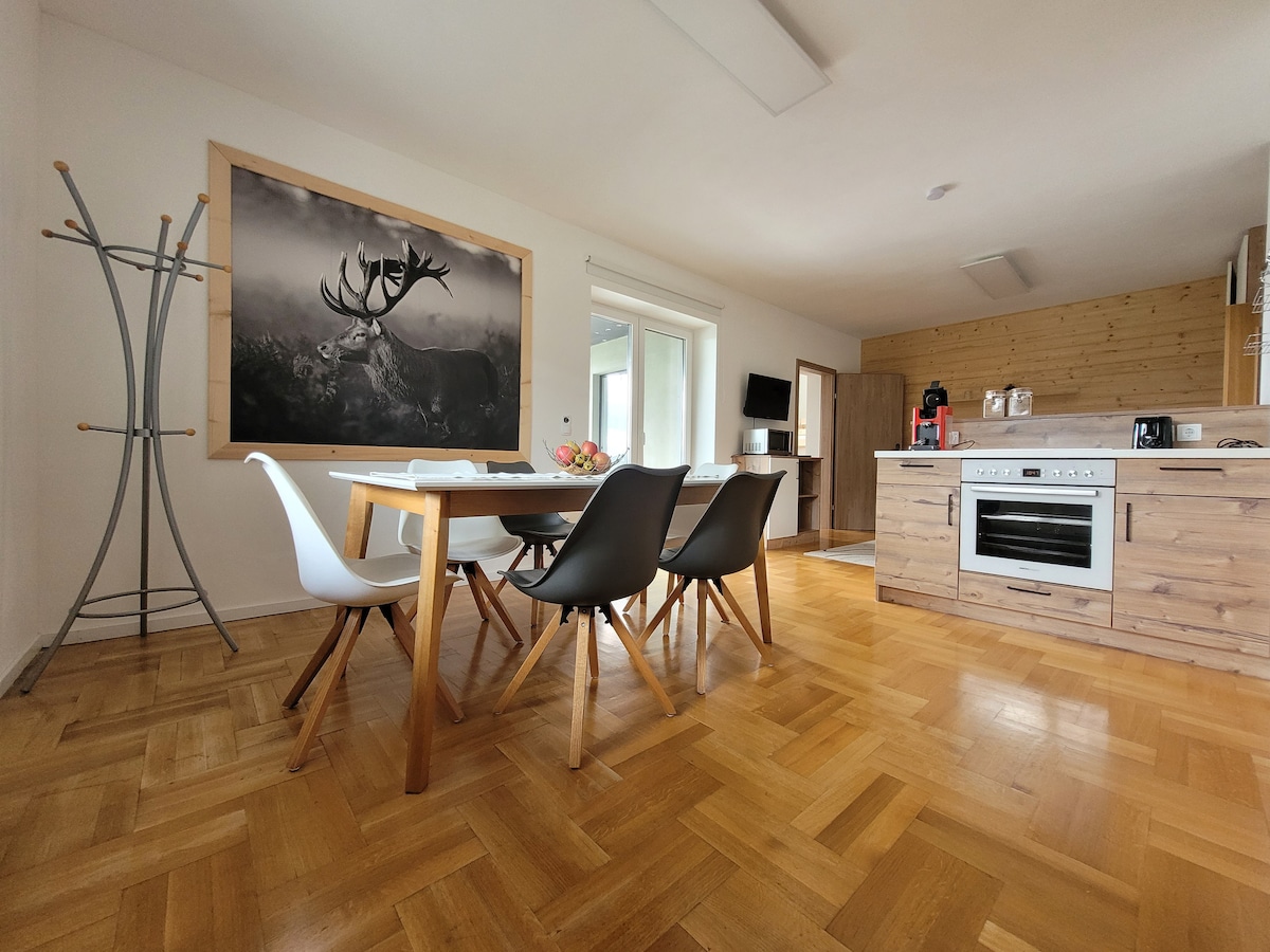 역사적인 교회 바로 맞은편에 위치한 디엑스 중심부의 넓은 75㎡ 아파트. 2025년에 완전히 개조되었습니다. 꽃, 햇살 좋은 산 전망, 평화로운 주변 환경과 함께 전용 정원을 즐겨보세요. 대형 침실 2개, 현대적인 주방, 욕실과 샤워실, 편안한 거실이 있습니다. 하이킹, 자전거 타기, 스키 또는 휴식을 즐기기에 좋습니다. 오스트리아, 이탈리아, 슬로베니아를 탐험하기에 이상적인 베이스. 무료 주차, 자전거/스키 보관소, 가족을 위한 편의시설이 포함되어 있습니다. 겨울에도 오스트리아에서 가장 햇살이 잘 드는 마을을 즐겨보세요☀️.