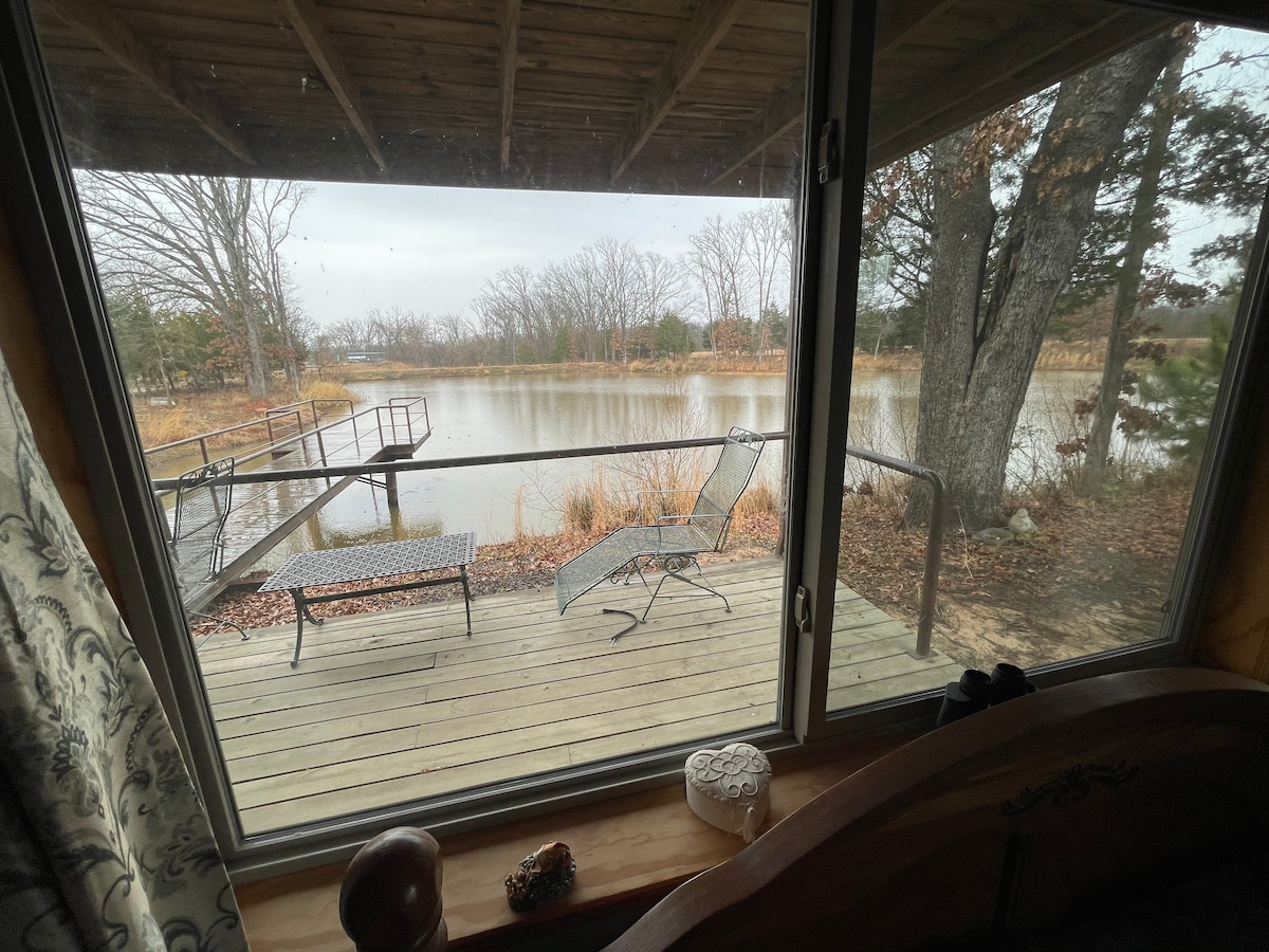 Our newly built 1300 sf large private cabin nestled under a large oak tree, positioned right on the bank of our private 2.5 acre lake with its own dock. Sleeps up to six guests, plenty of parking, and has three beds, a 90-year-old restored pool table upstairs in the large loft, 3 porches (both back porches overlook the lake) and custom cabinets throughout made of local hickory. Enjoy all the displayed paintings, photography, sculptures and cut stones all created by the hosts.