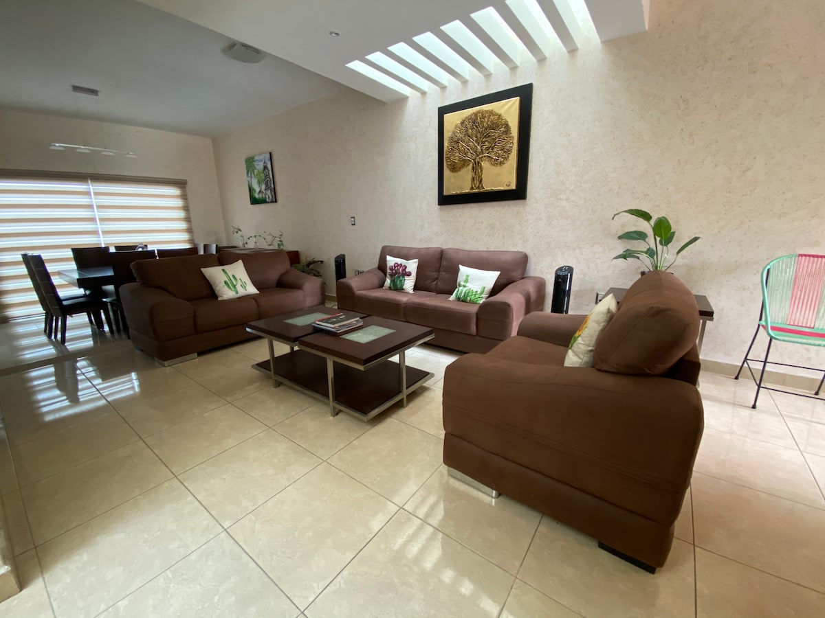 Lleva a toda la familia a este fantástico lugar cerca de toda la diversión de Boca del Río. A 3 min de la Playa! 🏖️Y si de negocios se trata, el WTC y las plazas comerciales se ubican a sólo 5 min. Excelente opción para grupos de 6, o más si es posible! (pregunta opciones) Amplia Casa de 3 Habitaciones, 3 Camas, 2. 5 baños. Estacionamiento Un Auto portón eléctrico. Cocina equipada con parrilla, horno, refrigerador y utensilios disponibles.
