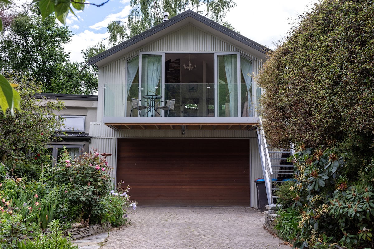 Amazing mountain views above Gibbston' s famous winery area. High up away from the noisy road we have 5 acres of garden. Your apartment, with its own front door is attached to our home but feels very private. It is newly redecorated with an open plan kitchen, lounge, dining room. Two bedrooms both with shower ensuites , one a king bed and the other a king or 2 single beds. Enjoy our log burning fire or go outside and enjoy the outdoor brazier while sipping a local wine and stargazing.