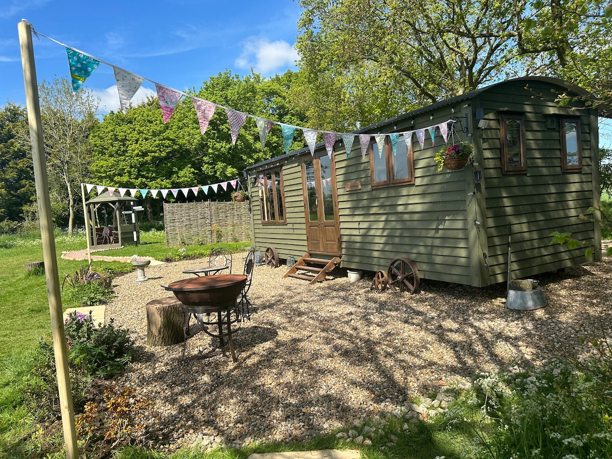 Our Premium shepherd’s hut Blackthorn Retreat sits alone in its own dog friendly 1/3 acre fenced meadow, with wonderful far-reaching views, lovely rural walks, amazing sunsets Perfect for reactive dogs Up to two large or three medium dogs welcome (even on the bed - we provide throws). A perfect getaway under the stars. Wonderful wood-fired hot tub available (for a fee). Wood-fired pizza oven & firepit. King bed, shower & kitchen inside the hut, heated floor, (+a/c in summer), washer + dryer