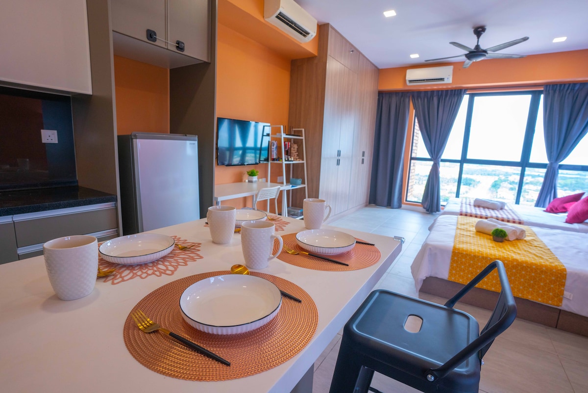 퀸사이즈 침대와 소파 베드가 있어 2~3명까지 수용할 수 있는 아늑한 스튜디오를 둘러보세요. KLIA T1/T2에서 차로 15분 거리에 있으며, 도보 거리 내에 레스토랑, 패스트푸드 매장, 식료품점, 세탁소가 많습니다. 어린이 놀이터, 바비큐 공간, 헬스장, 수영장 등 모든 편의시설을 이용하실 수 있으며 연중무휴 보안 서비스가 제공됩니다. * 체크인 시간 전에 짐을 맡길 수 없습니다. 건물 설계로 인해 엘리베이터를 타려면 계단을 10개 올라가야 합니다.