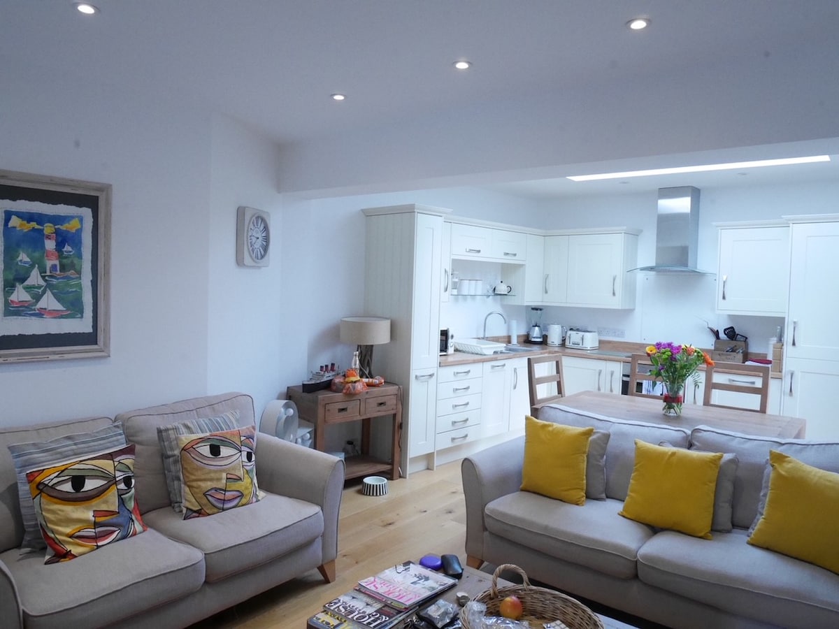 숨 막히는 바다 전망, 고급스러운 해변 아파트, 프레시워터 베이 - 와이트 섬의 뛰어난 자연 아름다움의 중심부에 있습니다. 숙소 앞면과 뒤편에 각각 하나씩 있는 두 개의 큰 발코니가 있는 아름다운 1층 아파트로 앞면에서는 바다가, 뒤편에서는 언덕이 내려다보입니다. 현장에 주차장이 있습니다. 아파트에서 바닷가까지 곧장 걸어서 갈 수 있습니다. 서핑 보드, 카약, 자전거를 위한 야외 안전 보관 가능. 아파트에서 아름다운 산책