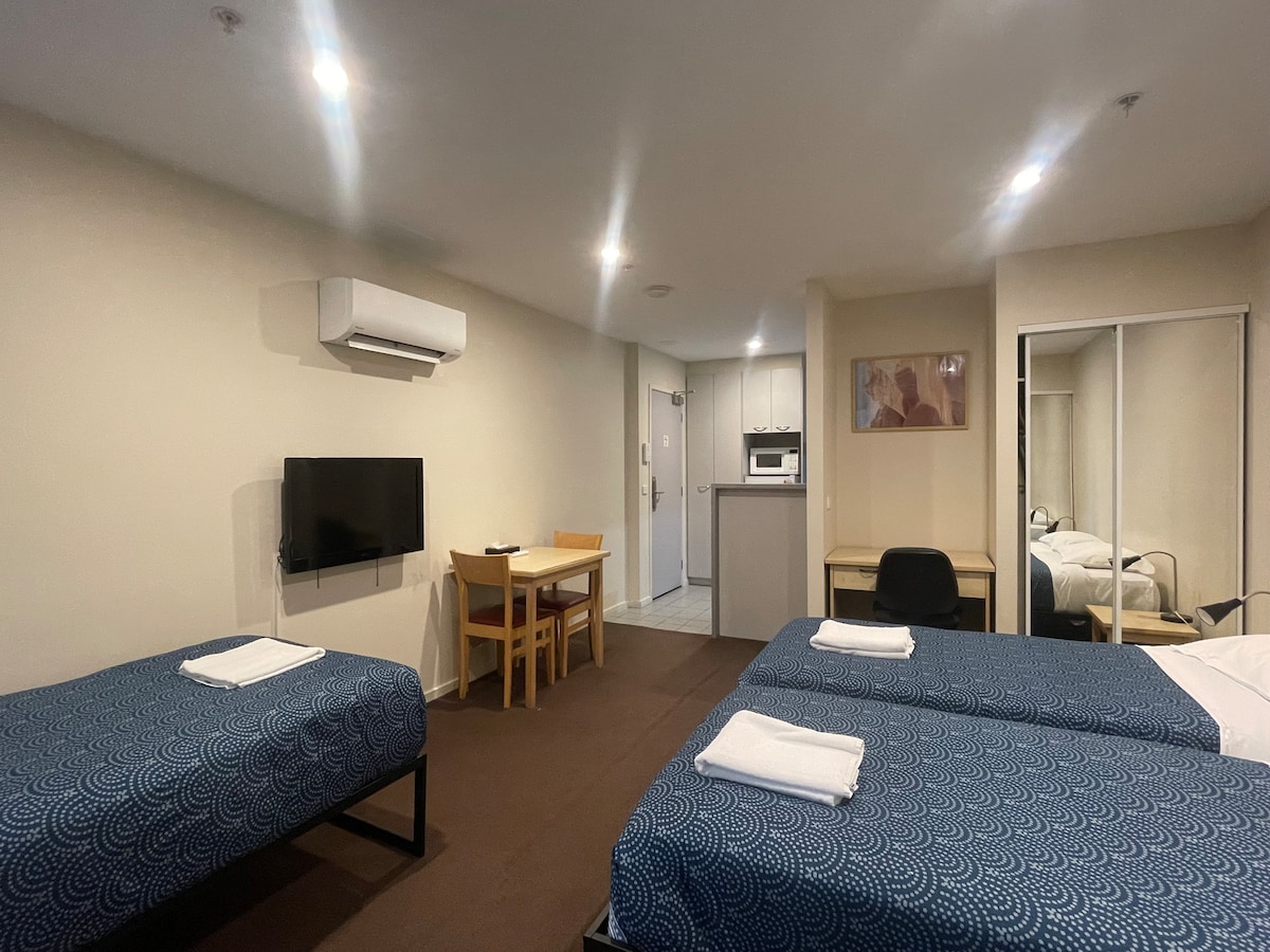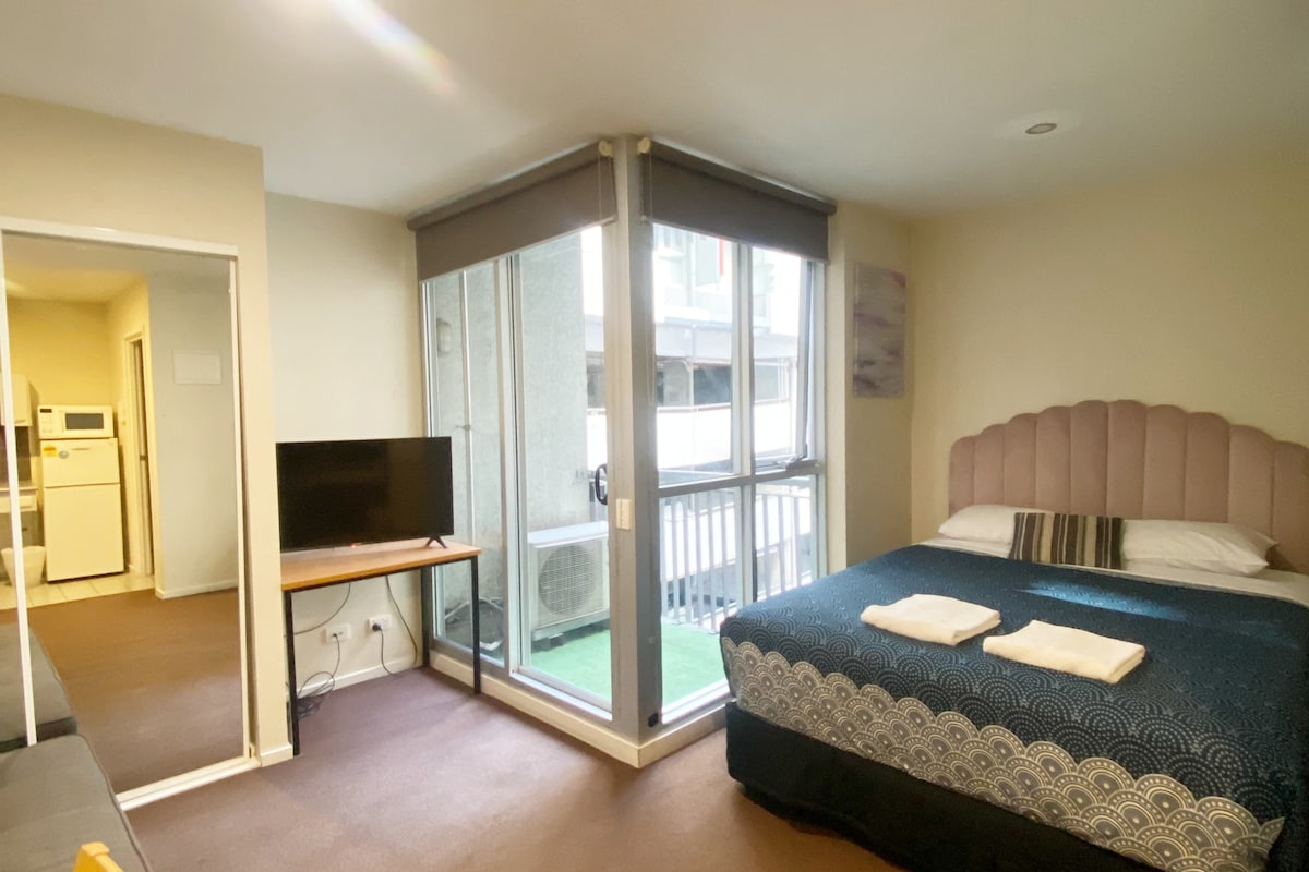멜버른 CBD의 킹 스튜디오로 킹사이즈 침대 1개와 싱글 침대 1개가 있어 3명이 숙박할 수 있습니다. 퀸 빅토리아 마켓, RMIT, 멜버른 센트럴, 라이건 스트리트, 차이나타운, 병원까지 도보 또는 트램으로 이동할 수 있습니다. 플린더스 거리, 크라운, MCG 및 독랜즈로 가는 트램 정류장이 문 앞에 있습니다. 간이 주방, 전용 욕실, 와이파이, 수영장, 헬스장, 사우나, 세탁 시설, 구내 카페, 안전한 유료 주차장(요청 시)이 포함됩니다. 커플, 1인 또는 소규모 가족 여행객에게 적합합니다.