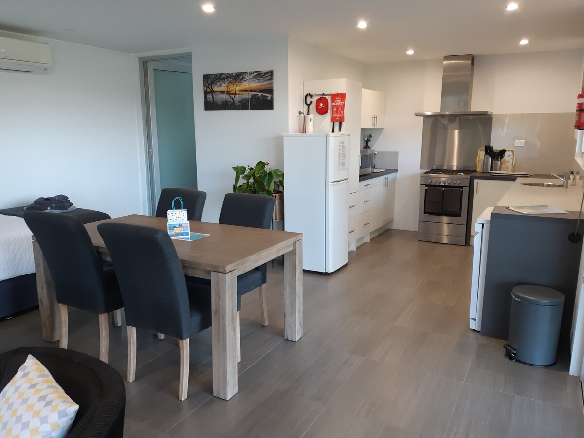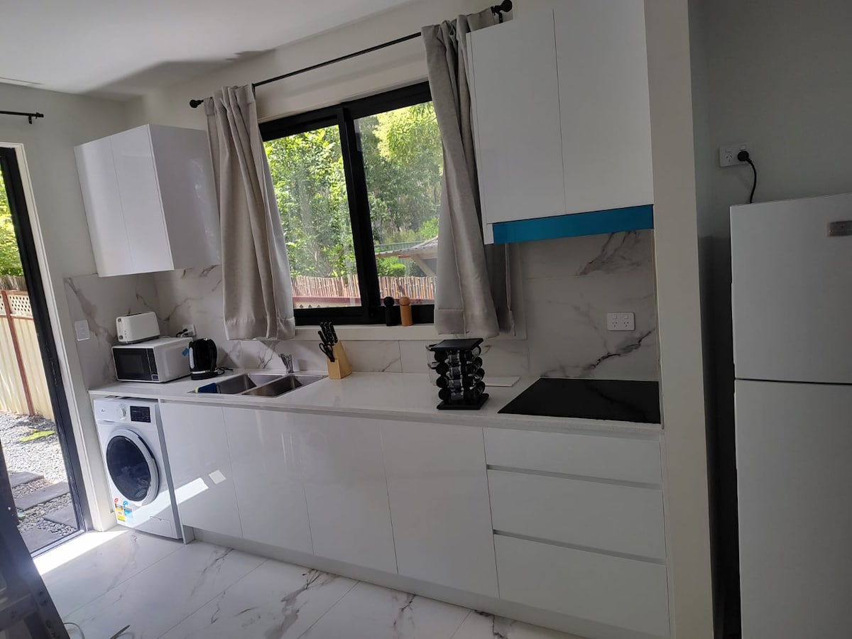 Situated between the beach & the lake at the end of a quiet cul-de-sac with a picturesque lagoon view! And only metres away from access to the famous new Fernleigh Track! This one bedroom fully equipped cozy house is brand new & spotlessly clean! Fully equipped with all linen, towels, soaps, shampoos, toilet paper, Nespresso coffee machine + coffee pods, kettle, instant coffee, tea bags, sugar, toaster, air fryer & all your kitchen essentials.