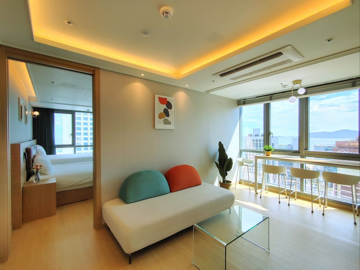 거실 창문 너머로 부산항대교 오션뷰가 정면으로 펼쳐지는 레지던스 아늑하고 세련된 분위기 속에서 가족·친구·연인 누구나 편안하게 머물 수 있습니다 ▪️모바일 셀프 체크인 ▪️KTX,SRT 부산역 연결통로 도보 5분 ▪️무료주차/주차장 내 전기차 충전소 ▪️객실별 제어 최적 냉/난방 시스템 ▪️남포동,서면 등 편리한 원도심 접근성 ▪️해운대,광안리 이동편의 ▫️LG 시스템 에어컨 ▫️LG 스팀 의류관리기 ▫️삼성 냉장고 ▫️삼성 세탁기 ▫️삼성 건조기 ▫️삼성 식기세척기 ▫️삼성 오븐레인지 ▫️식기+조리도구 (조미료X) ▫️스마트 65인치 TV(OTT-본인계정) ▫️고속 와이파이