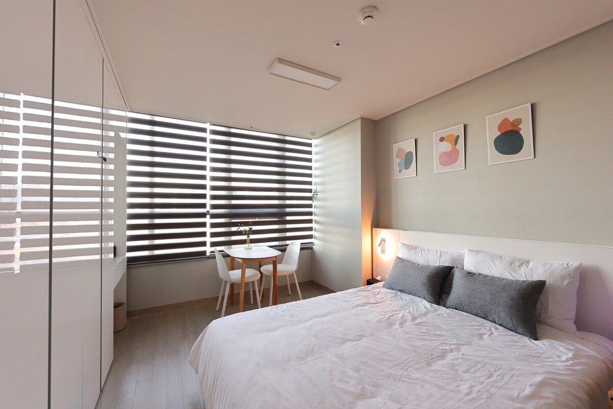 [넓은 킹베드룸] 편안하고 안락하게 쉴 수 있는, 휴식&업무&요리 모두 가능한 만능 공간
