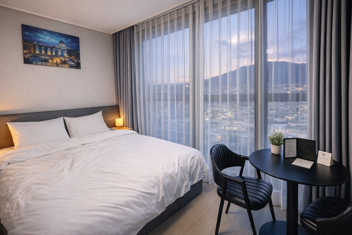 2023년 신축건물로 제일 탑층에 위치한 저희 숙소는 밤에는 멋진 야경과 낮에는 바다뷰와 시티뷰를 동시에 느낄수 있습니다~~ 간단한 식사를 조리할수 있으면 모든 집기류과 침구류는 항상 청결하게 관리하고 있습니다^^ 복층에 침대가 준비되어 있어 누워서도 야경을 볼 수 있고 푹신한 잠자리에서 편안한 휴식을 취할수 있습니다~~