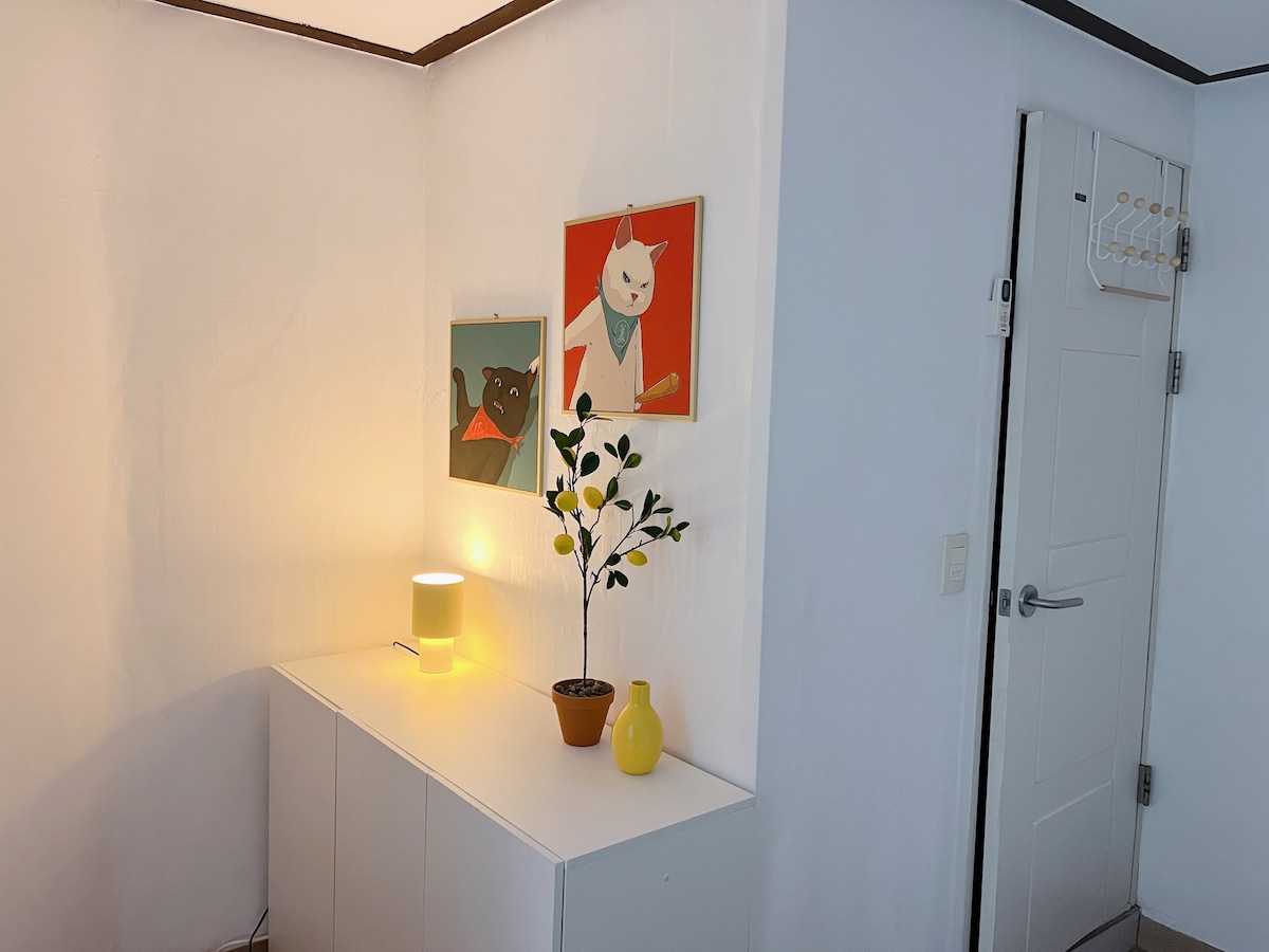 A bright modern studio in the very center of Hongdae. Minimal yet warm with bright yellow accents, the studio is equipped with a full kitchen, fridge, washer(that has dryer function), AC, floor heating(even in the bathroom), a full bathroom, a Queen size bed(1500mm width), a spacious work station/table(1400mm width), and other meticulous amenities you may need. Located on the first floor of a 4 story house building (where my family lives on the top floor) with a separate entrance for you.