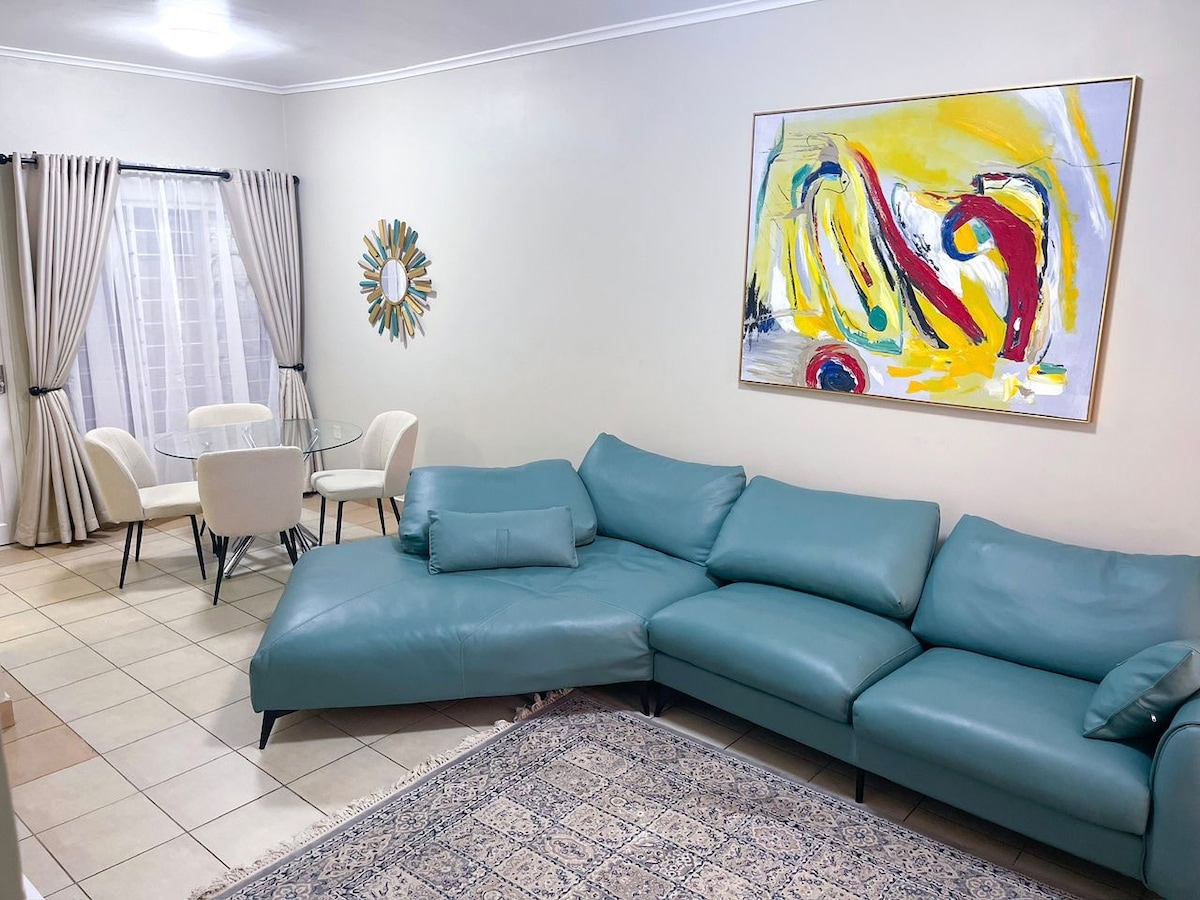 Modern, private, and perfectly located! Enjoy an LG Dual Inverter AC, LG OLED Evo AI 55" TV (2025 model) with Netflix, Prime Video & YouTube. Starlink WiFi. 2m orthopedic hybrid bed, 24/7 power, hot water, a solar iron, and a full kitchen with gas stove, double-door fridge, bar stools, and cocktail glasses. Relax in a cozy living room with a ceiling speaker, workspace, and beautiful couch. Just 5–10 minutes from six malls. You’ll love it here. Book now!
