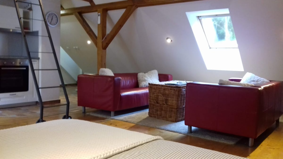Entspanne dich mit der ganzen Familie oder Freunden in diesem 216 qm großen, direkt am Park liegenden Loft. Auf dem Balkon kann man grillen und schaut dabei ins Grüne. Das riesen Wohnzimmer bietet Platz zum Tanzen oder einfach nur gemütlich am Ofen zu sitzen, Tischtennis zu spielen oder zu kickern. Im Bad gibt es eine geschlossene Badewanne mit Musik und eine Waschmaschine. Die Küche ist komplett eingerichtet. Vier Schlafzimmer gibt es mit je zwei Betten 😊 Außerdem Bücher und Spiele.