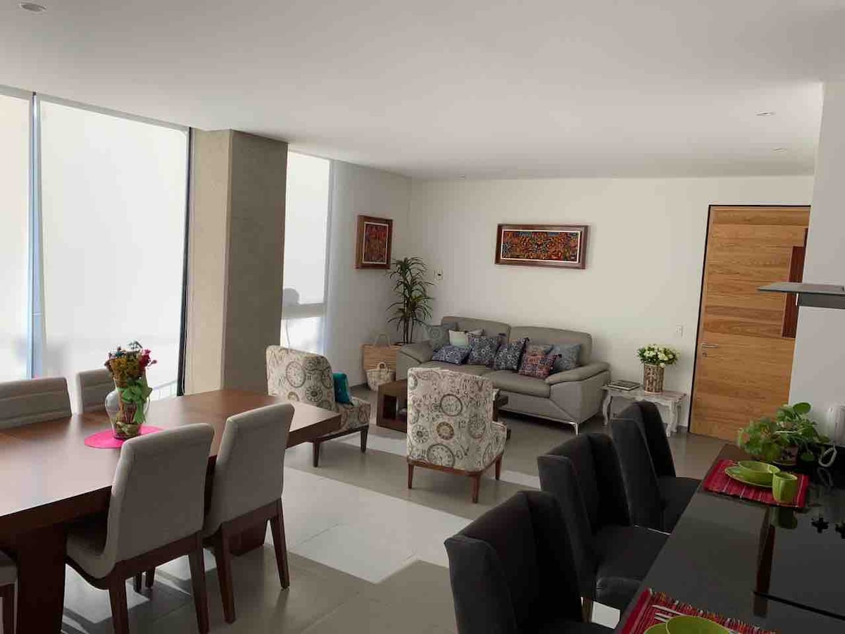 아름다운 로프트, 테라스가 있어 매우 편안하고 시원합니다. 1층에는 휠체어, 장기 숙박, 퀸사이즈 침대 1개와 매트한 소파 베드가 있으며, 욕실과 샤워실에 브래킷이 있으며, 장애인과 장애인이 있는 사람들에게 적합하며, 시설이 완비된 주방, 거실 및 TV는 50인치 4k입니다. 대학, Panamericana, Univa, Autonoma, ITESO, Tec de Monterrey, Ciudad Judicial, Estadio Akron에 인접해 있습니다. 에스파시오 갈레리아스, 과달루페 광장, 갈레리아스 광장 등 3개의 쇼핑몰과 가깝습니다.