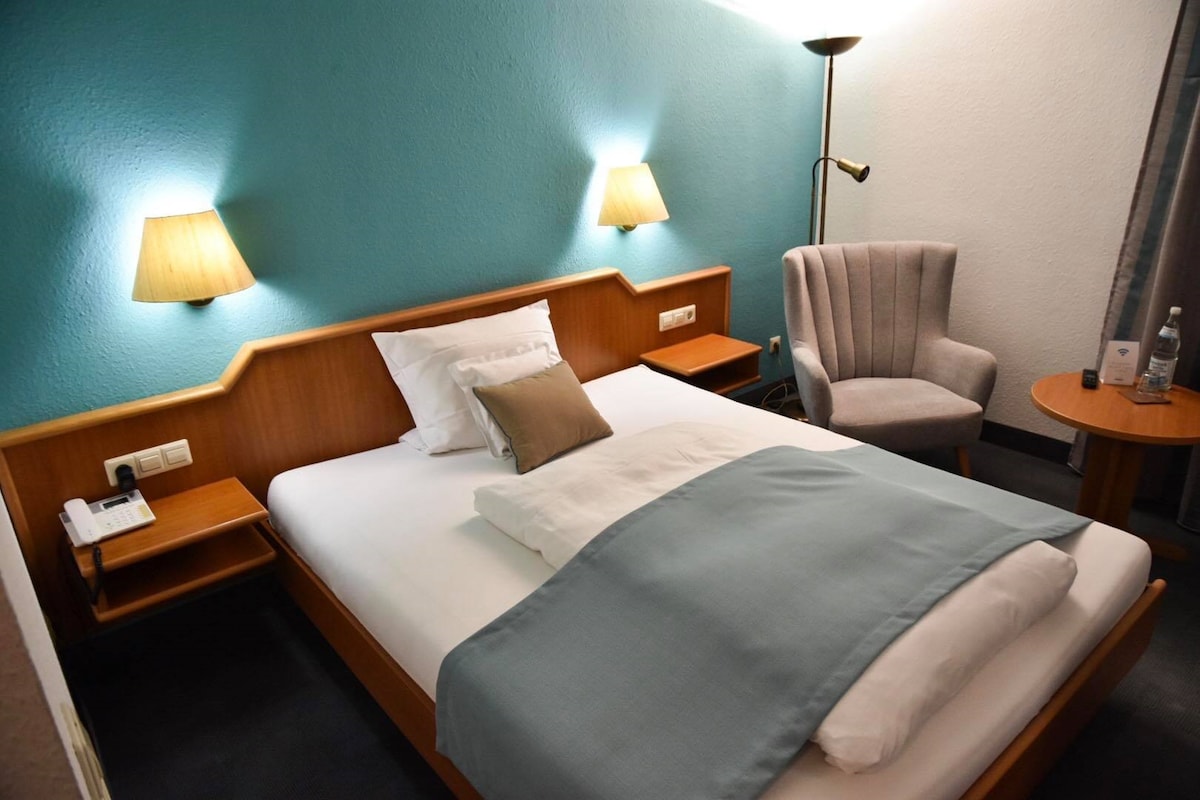 Unser komfortables Doppelzimmer verfรผgt รผber zwei separate Einzelbetten (je 90x200 cm) und eignet sich ideal fรผr Geschรคftsreisende, Paare oder Freunde. Das Zimmer ist hell und funktional eingerichtet und bietet: โ eigenes Badezimmer โ kostenloses WLAN โ TV โ Schreibtisch โ Kleiderschrank โ Kaffee- und Teezubereitungsmรถglichkeit im Aufenthaltsraum Bettwรคsche und Handtรผcher sind selbstverstรคndlich inklusive. Die Unterkunft liegt ruhig am Kurpark und bietet gleichzeitig eine gute Anbindung an die Innenstadt.