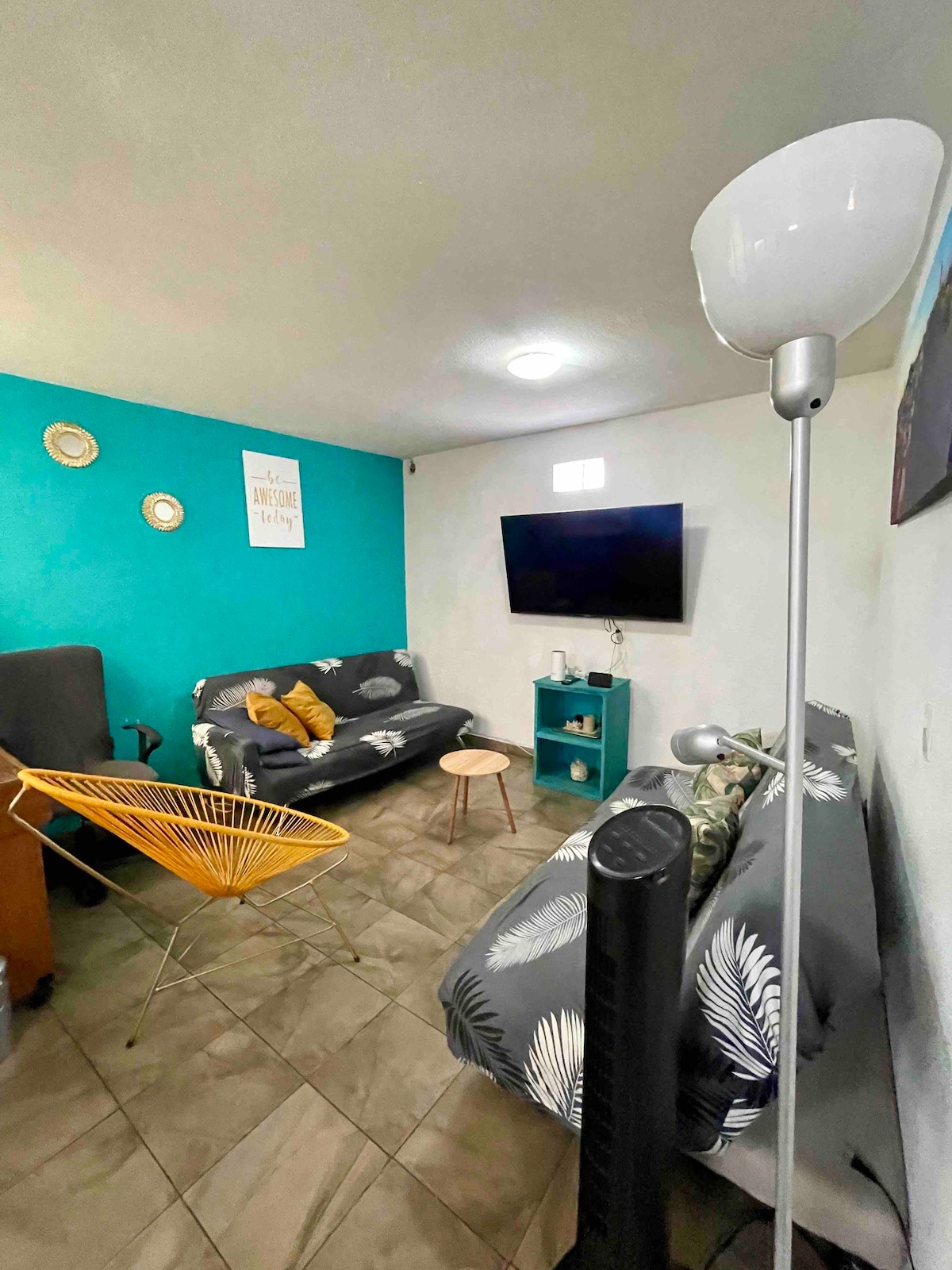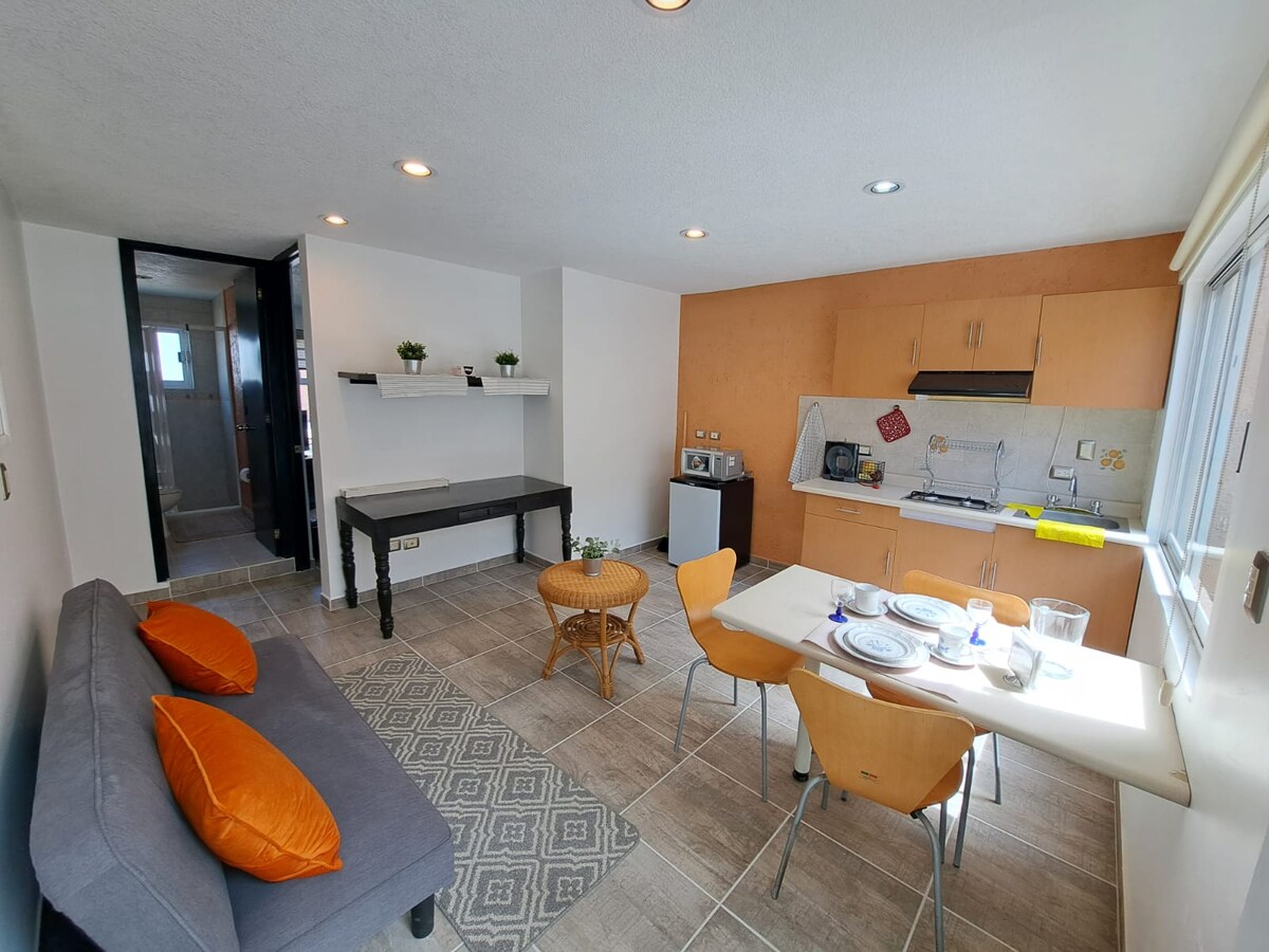 Bonita suite en planta baja, ubicada a calle y media de la pirámide y zona arqueológica de Cholula. Te ofrecemos una habitación matrimonial con baño propio una pequeña cocina para PREPARAR ALIMENTOS BÁSICOS así mismo un microondas y frigobar. 🛎️NOTA IMPORTANTE: -FAVOR DE LEER con atención las políticas de cancelación, las REGLAS DEL LUGAR y PARA EL ACCESO. -NO SOMOS UN HOTEL somos un pequeño espacio diseñado para viajeros como tú y como yo. GRACIAS POR TU ATENCIÓN Y COMPRENSIÓN.🤝
