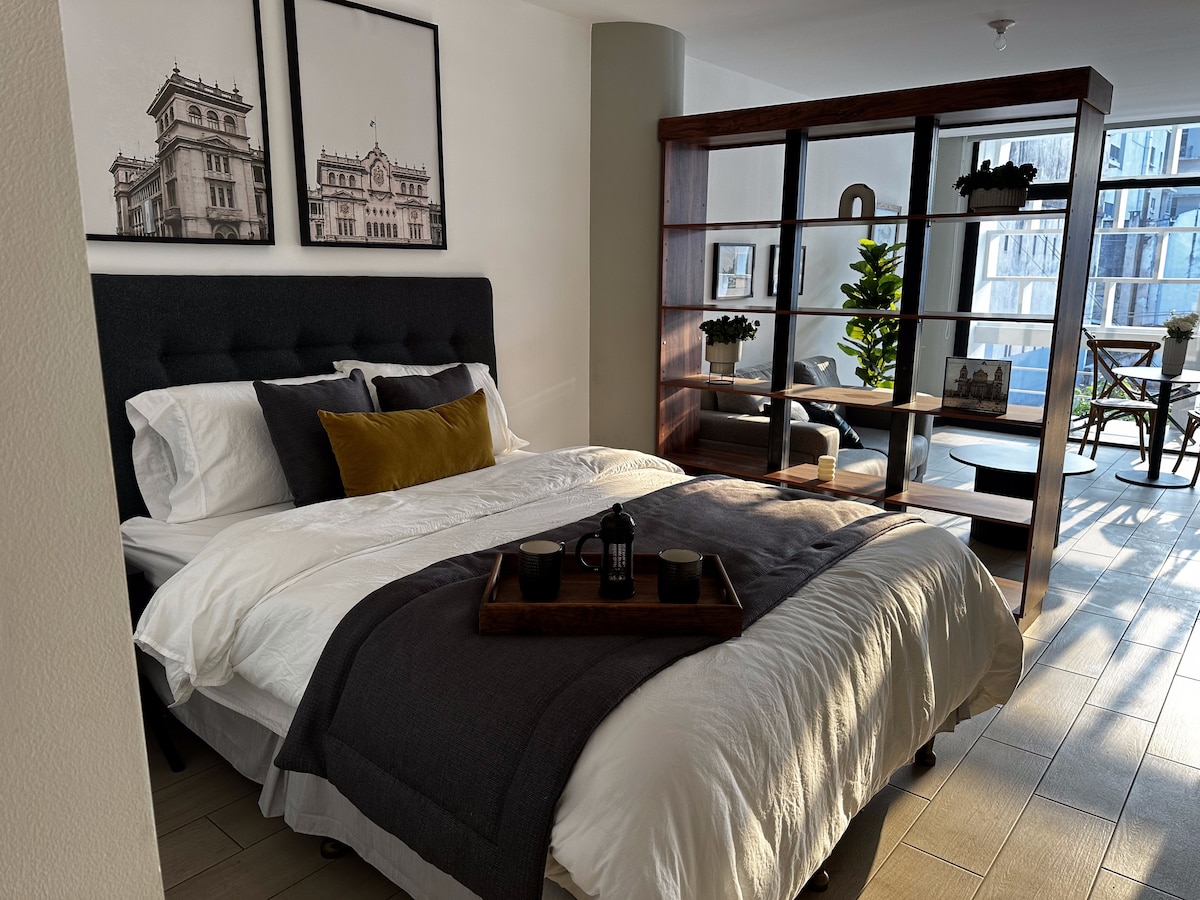 "Descubre este exclusivo apartamento en el corazón de la Ciudad de Guatemala, situado en un emblemático edificio recién renovado. Su decoración moderna y atención al detalle hacen de este espacio un lugar único e irrepetible. Disfruta de su luminosidad, comodidades como TV, cocina equipada, ducha caliente, Wi-Fi (internet de 200 Mbps de velocidad) y más. Incluye un dormitorio con cama matrimonial y otro con dos literas."